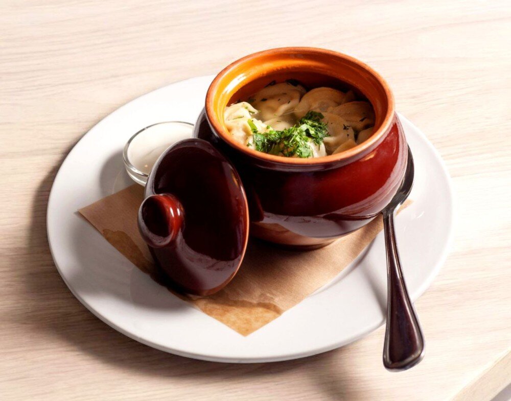 Домашние пельмени ручной лепки из говядины подается со сметаной и на выбор с бульоном/без бульона. украшается зеленью